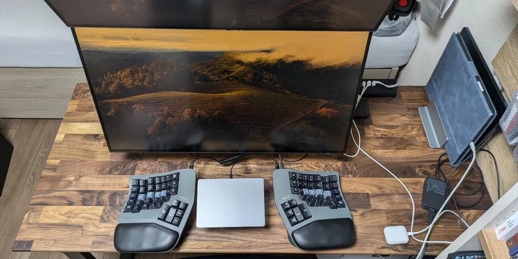 - 後から気づいたが、モニタアームはクランプで付けるより、穴あけオプションで天板に穴を開けてグロメット式で取り付けた方が強度的には良かったのかもしれない。